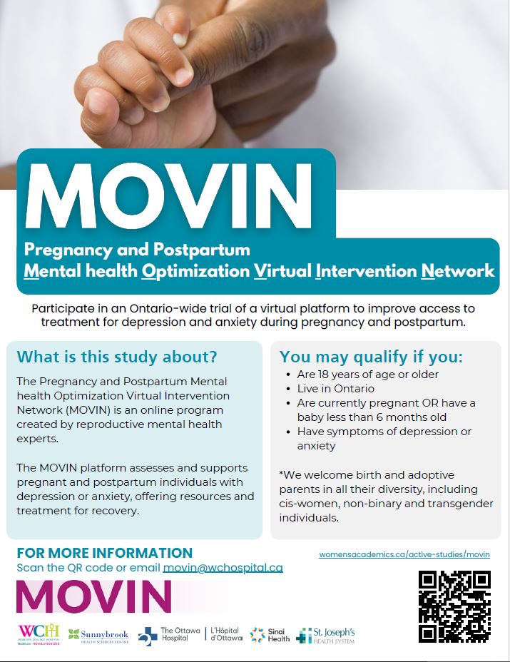 Women’s College Hospital is conducting a trial and looking for research participants to see if using The Pregnancy and Postpartum Mental health Optimization Virtual Intervention Network (MOVIN), helps reduce depression and anxiety symptoms.